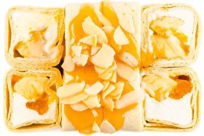 Стоит заметить, что компания «Макароллыч» в Ижевске даже готова предложить сладкие роллы тортилья. Так, их основу составляют банан, манго, сгущенное молоко, шоколадный топпинг, миндальные лепестки.