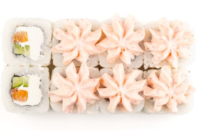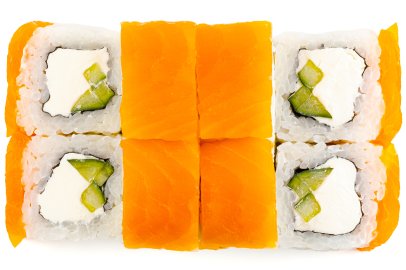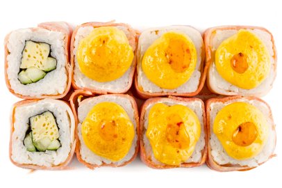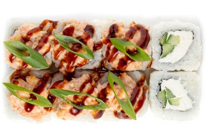 Рис, Нори, Огурец, Лосось, Соус терияки, Соус спайс, Сыр плавленный, Лист салата,