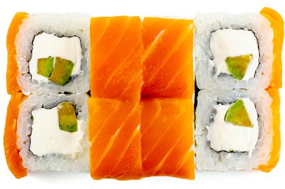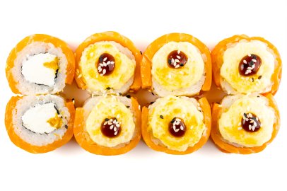 Лосось, Нори, Рис, Сыр сливочный, Унаги соус, Соус Фирменный, Манго,
