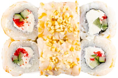 Рис, Нори, Манго, Майонез, Соус кисло-сладкий, Креветка, Арахис,