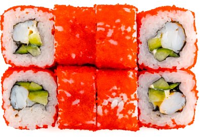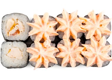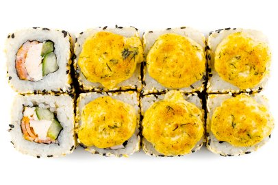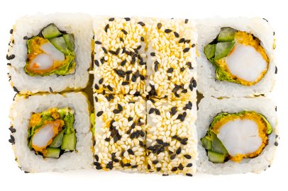 Кунжут, Лист салата, Майонез, Нори, Огурцы, Рис, Соус Терияки, Креветка темпура,