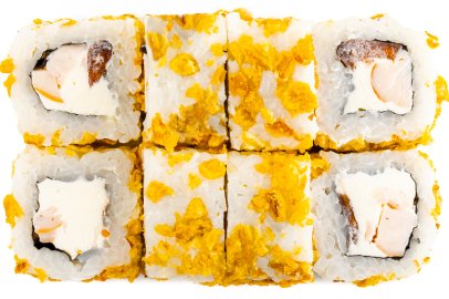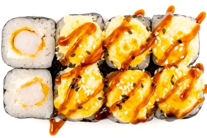 Кунжут, Нори, Рис, Сыр сливочный, Унаги соус, Соус чесночный, Креветка темпура,