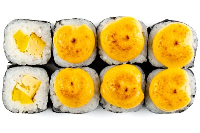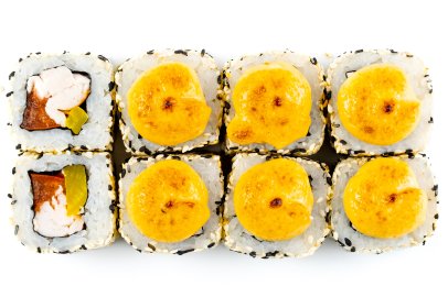 Рис, Нори, Омлет Тамаго, Сыр сливочный, Угорь, Шапка (моцарелла, майонез, чеснок), Соус Унаги ,