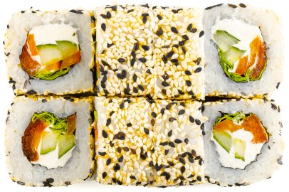Кунжут, Лист салата, Нори, Огурцы, Перец болгарский , Помидор, Рис, Сыр сливочный,