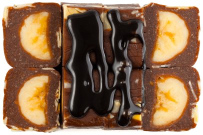 Печенье, сгущенное молоко, сливочное масло, какао, банан, лепестки миндаля, шоколадный топпинг,