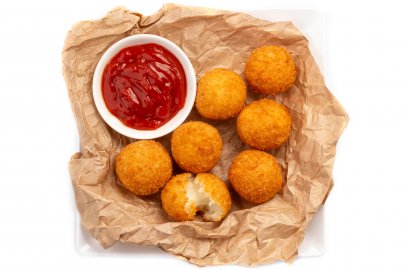 - Сырными шариками. Привлекают ярким сырным вкусом, хрустящей текстурой, тягучестью, разнообразием видов. Хорошо сочетаются с кисло-сладким или томатным соусом.