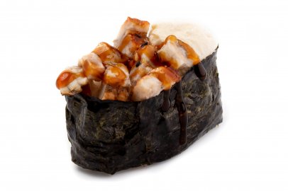 Рис, Нори, Омлет Тамаго, Сыр сливочный, Угорь, Шапка (моцарелла, майонез, чеснок), Соус Унаги ,