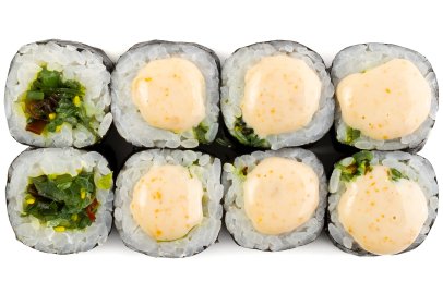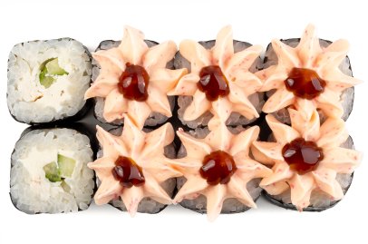 Рис, Нори, Огурец, Лосось, Соус терияки, Соус спайс, Сыр плавленный, Лист салата,