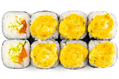 - Разнообразием начинок. Среди наиболее популярных вариантов нужно выделить: лосось, форель, семга, авокадо, огурец, сливочный сыр, крабовые палочки, мидии, креветки и прочие. Добавками часто выступают соевый соус, спайси-соус, кунжутное масло, икра летучей рыбы.